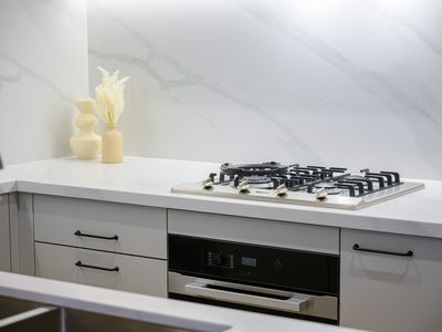 Gourmet Miele kitchen featuring marble benchtops, gas cooktop, stone splashbacks, and ducted rangehood