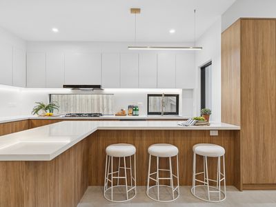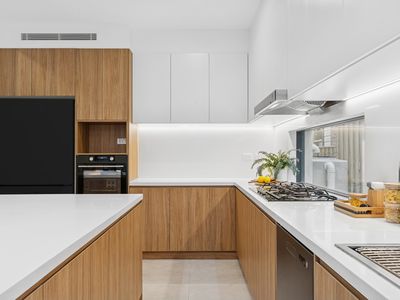 - Luxurious kitchen with sleek stone benchtops, quality appliances, gas cooking, and ample storage